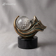 A striking decorative sculpture featuring a crystal sphere framed by sculpted metal waves and mountain forms. Designed to reflect light and movement from every angle.